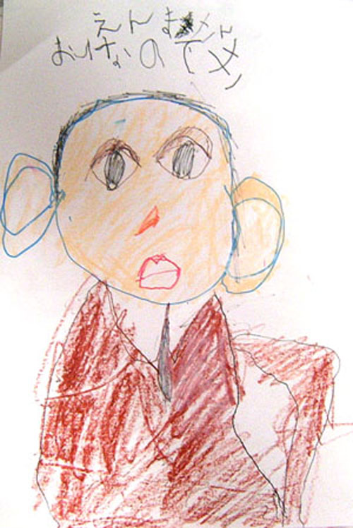 最初「えんまきん」と書いたのを、「まちがえた!」と言って塗りつぶし「えんまさん」と書き直した跡が生々しく残っている。書き直さなければ、イジメになってしまう。ことのあろうか5才児にいじめられたとあっては、ファントマを主宰する氏の面目丸つぶれである。書き直してくれてヨカッタ。劇場で真剣に腹筋善之介にダメだししているえん魔氏に、突然カンチョウで奇襲した時は、驚いて誰も口がきけなかった。喜び転げる京花を、えん魔さんが寛容に許してくださったことは、私の記憶に新しい。恐れ(行儀?)を知らぬ、我が子よ、良い子に成長して欲しい。