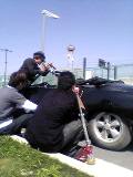 青空の下、残った車のシーンを撮る人たちの写真集。
